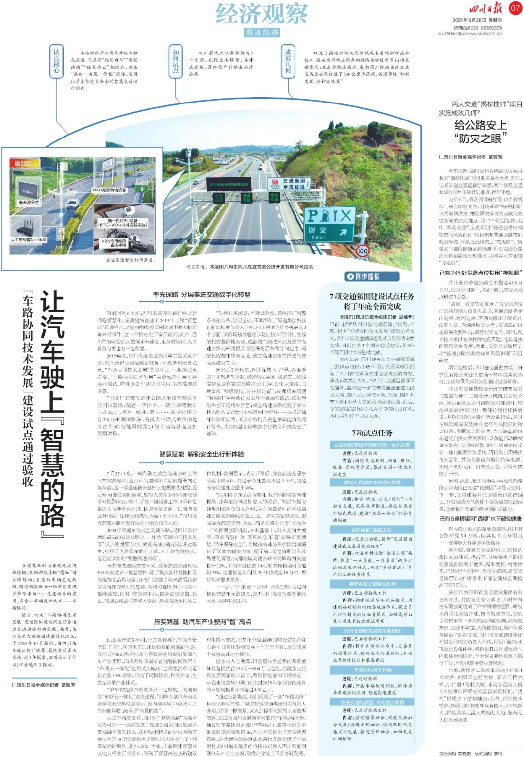 历经近5年攻坚,四川在技术、产品、标准等方面实现多重突破。成都绕城高速、成都第二绕城高速及成宜高速公路打造了340公里示范线,实现事故“秒级发现、分钟级处置”;成都绕城高速“智慧眼”平台通过85公里全息感知覆盖,联动导航平台实现精准预警;成宜高速公路的数字孪生技术则为交通数字化转型树立标杆……交通运输部验收组认为,试点有效提升安全保障能力和通行效率,为公路基础设施数字化转型升级奠定了基础。