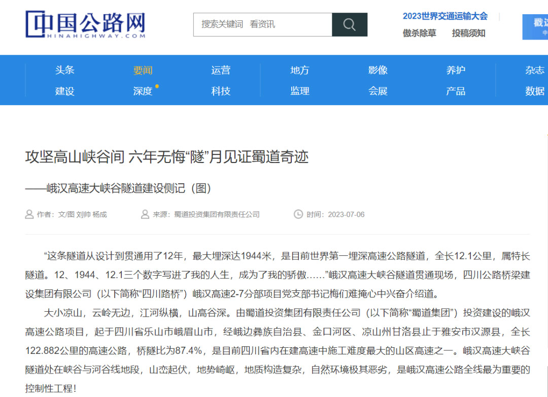 近日,《中国交通报》、《中国公路》报道了峨汉高速大峡谷隧道建设纪实。