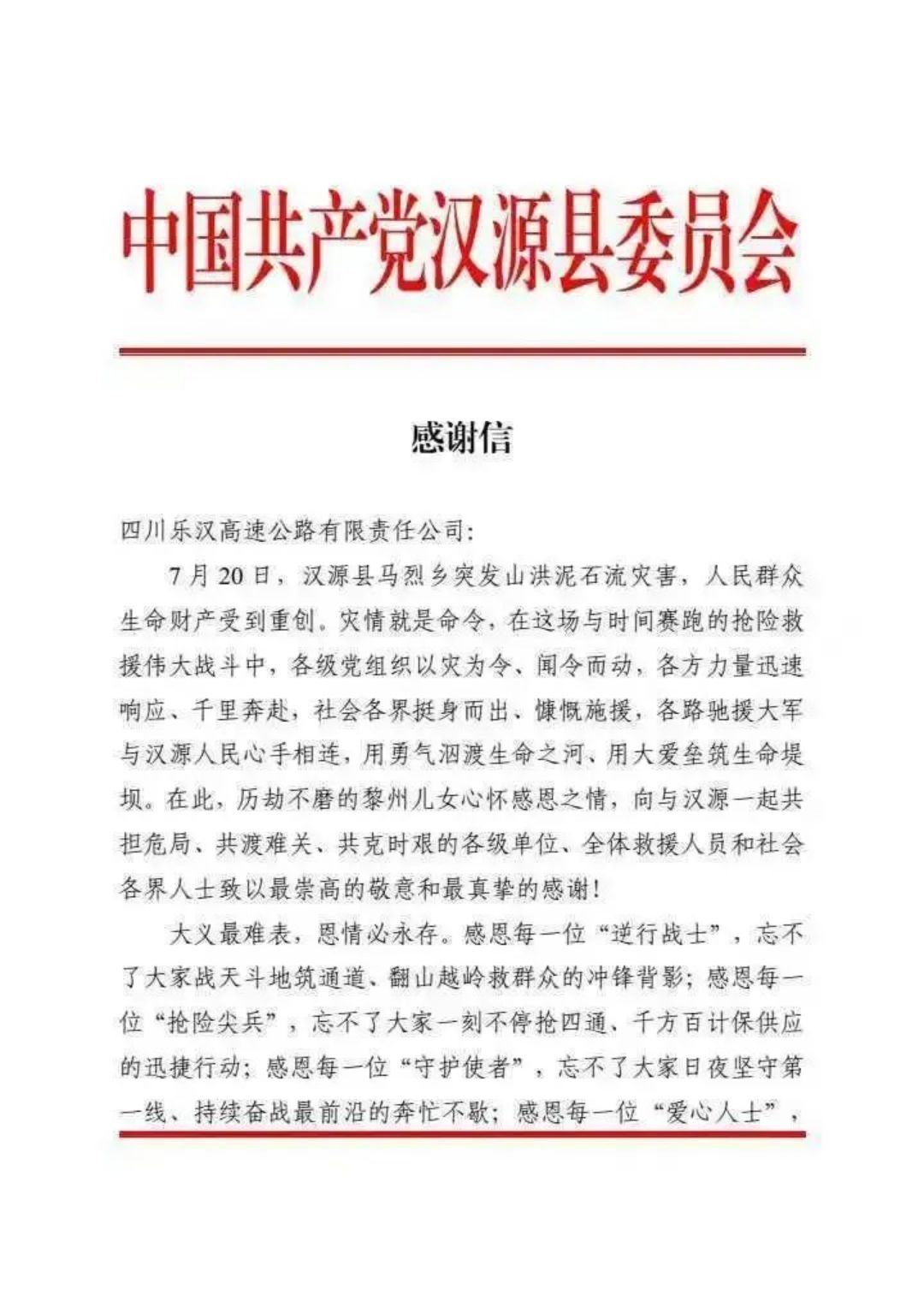 这份感谢信不仅承载着汉源地方政府及人民群众对乐汉公司在此次防汛救灾中所做工作的感激,更体现出深厚的企地情谊,是对全体乐汉人的认可和鼓舞。
