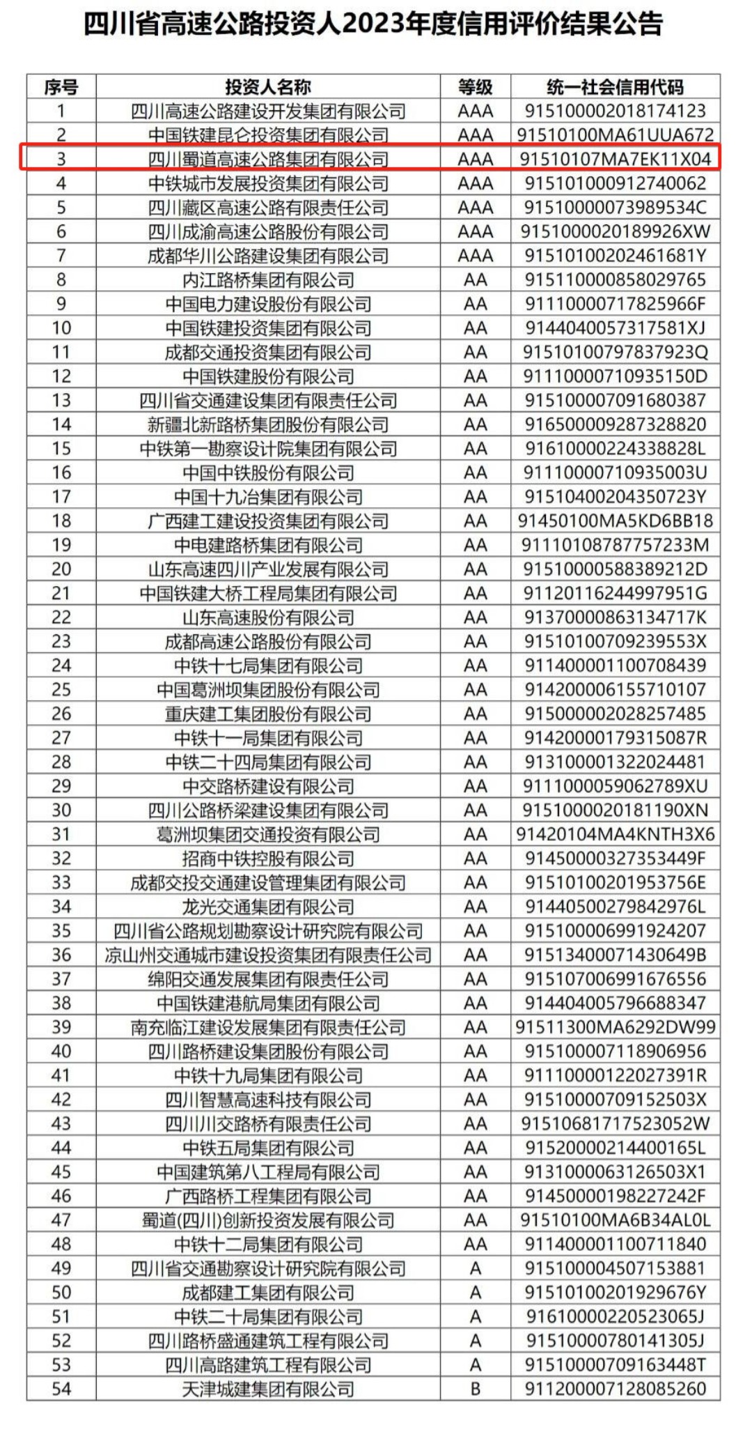 近日,四川省交通运输厅官网发布公告,williamhill英国官网集团在四川省高速公路投资人2023年度信用评价中被评为AAA等级。此次评价是根据《四川省交通运输厅关于修订印发<四川省高速公路投资人信用管理办法>的通知》(川交发〔2021〕20号)和《关于加强高速公路投资人年度信用评价的通知》(川交函〔2022〕324号),经初评、审定、公示等程序,取得2023年度信用评价等级名单公布如下: