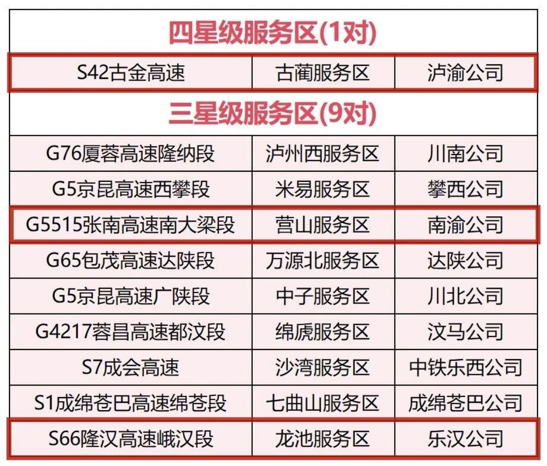 近日,四川省交通运输综合行政执法总队、四川省交通运输厅高速公路管理局联合印发了《关于2025年全省高速公路服务区星级评定结果的通知》,williamhill英国官网集团多家所属公司运营服务区上榜——泸渝公司古蔺服务区获评2025年度全省唯一“四星级服务区”称号,南渝绵南公司营山服务区、乐汉公司龙池服务区获评“三星级服务区”称号!
