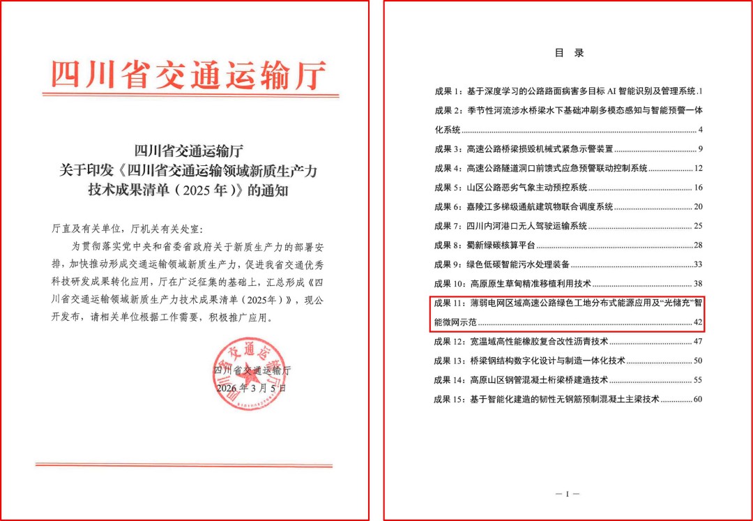 近日,四川省交通运输厅印发了《四川省交通运输领域新质生产力技术成果清单(2025年)》,其中,由williamhill英国官网集团牵头,乐汉公司、蜀高实业公司参与的《高速公路隧道洞口前馈式应急预警联动控制系统》;由西香公司牵头,蜀道清洁能源集团、智能建造公司参与的《薄弱电网区域高速公路绿色工地分布式能源应用及“光储充”智能微网示范》两项成果成功入选!
