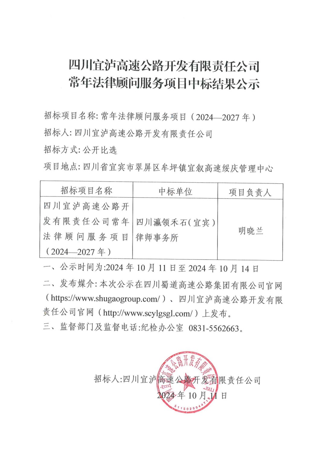 四川宜泸高速公路开发有限责任公司常年法律顾问服务项目中标结果公示