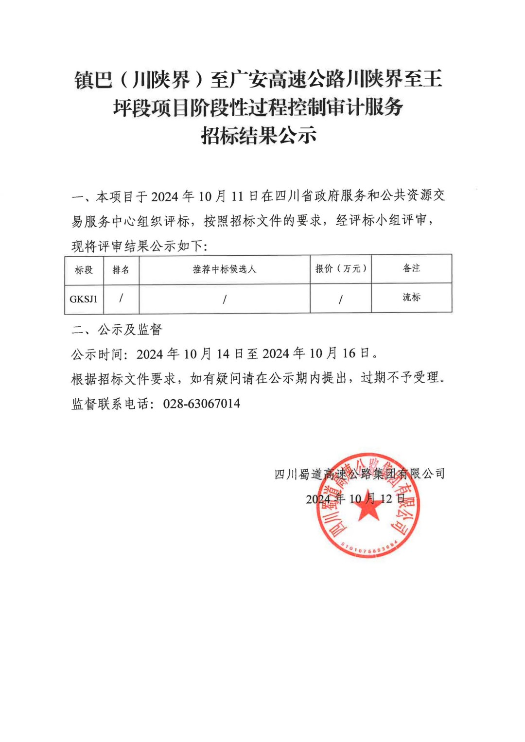 镇巴(川陕界)至广安高速公路川陕界至王坪段项目阶段性过控审计服务评标结果公示