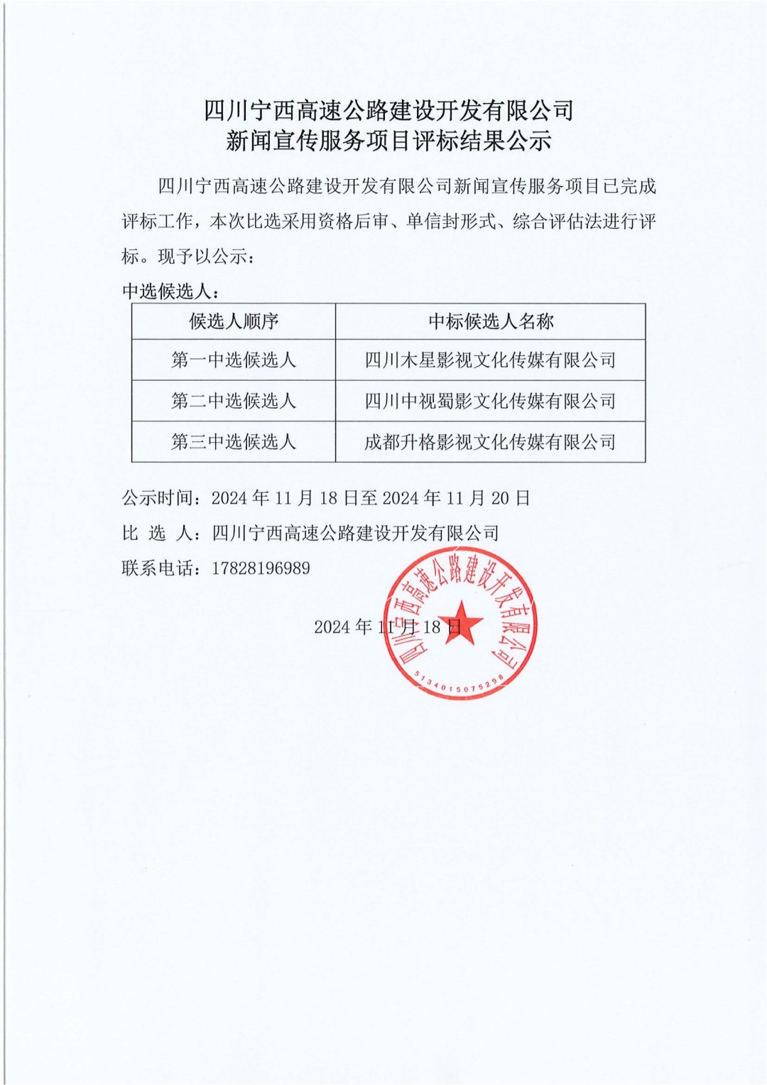 四川宁西高速公路建设开发有限公司新闻宣传服务项目评标结果公示