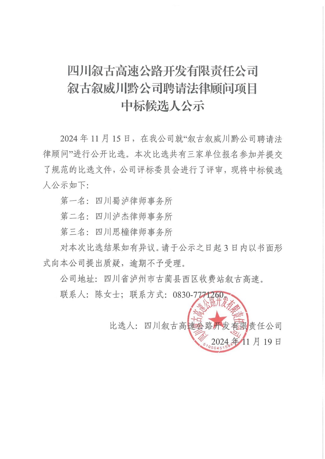 叙古叙威川黔公司聘请法律顾问项目中标候选人公示