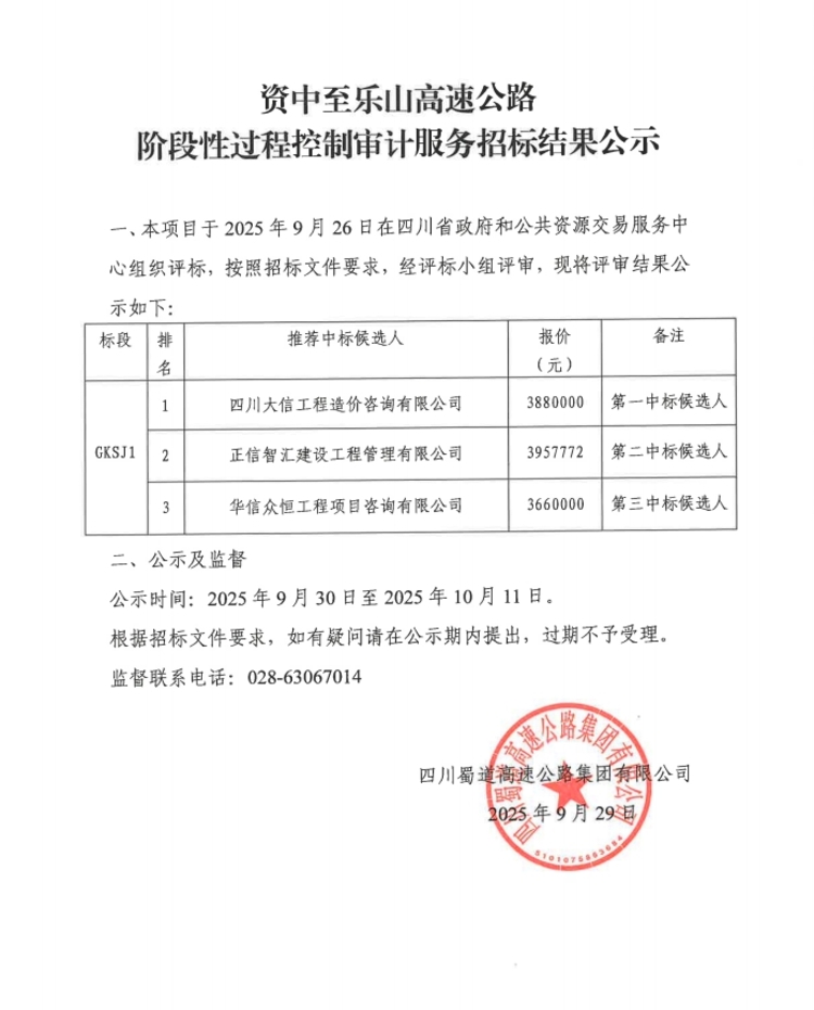 资中至乐山高速公路阶段性过程控制审计服务招标结果公示