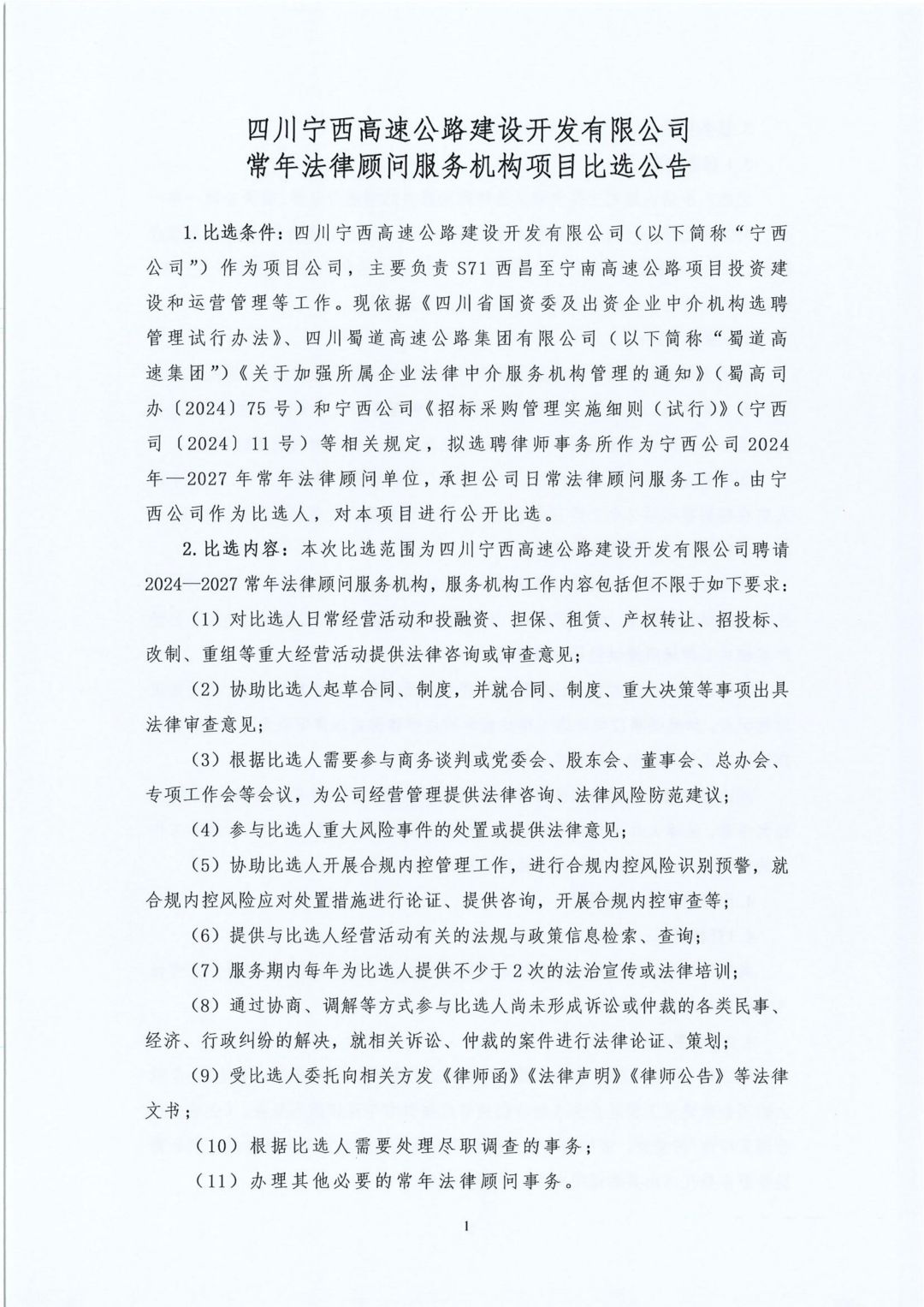 四川宁西高速公路建设开发有限公司常年法律顾问服务机构项目比选公告