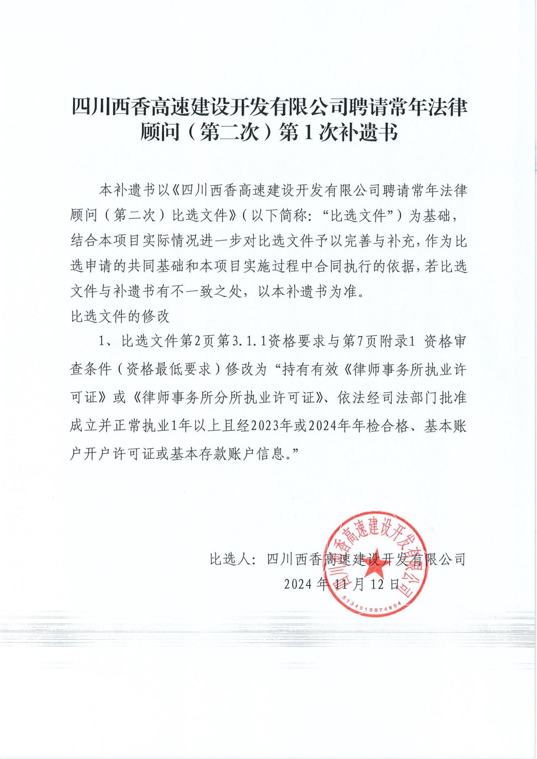 四川西香高速建设开发有限公司聘请常年法律顾问(第二次)第1次补遗书