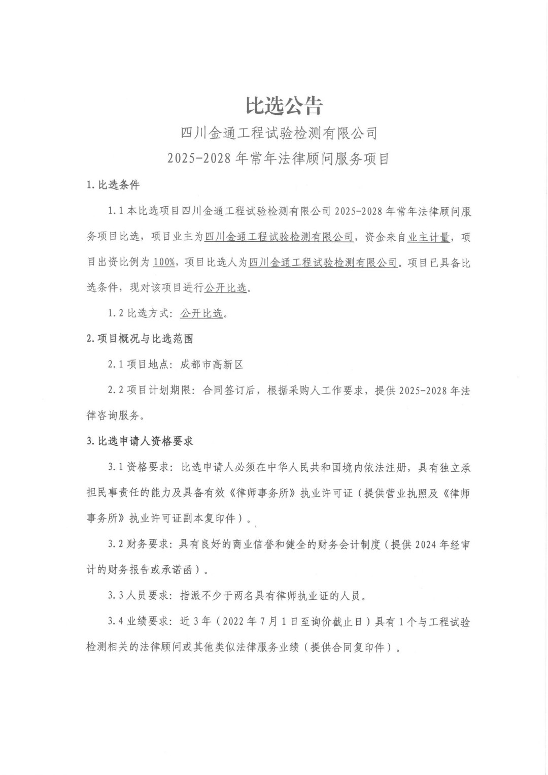 四川金通工程试验检测有限公司2025-2028年常年法律顾问服务项目比选公告